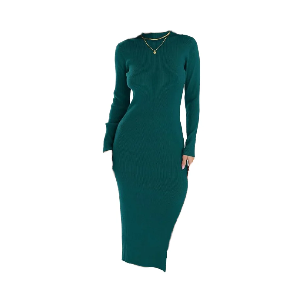 Women's 2025 Ribbed Knit Casual Turtleneck Slim Fit Natural Waist Solid Midi Dress Long Sleeve Side Slit Autumn